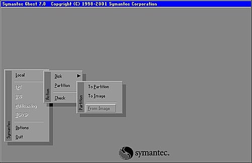 Ghost 7.0 版 本 作 示 範 , 介 面 上 可 能 與 其 它 版 本 略 有 不 同 , 但 各 版 本 功 能 相 若 , 故 此 不 需 理 會 版 本 問 題 。其 實 還 原 的 步 驟 一 點 也 不 難 , 只 不 過 是 把 備 份 的 方 法 倒 過 來 做 。 請 依 照 下 圖 指 示 依 序 選 取 Local > Partition > From Image 。